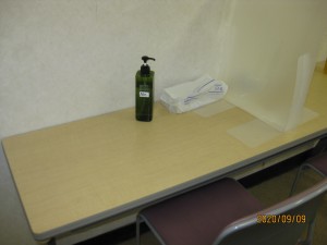 ・職員の休憩の際、休憩用のテーブルに座る前、退席時に周囲の消毒を行っています。