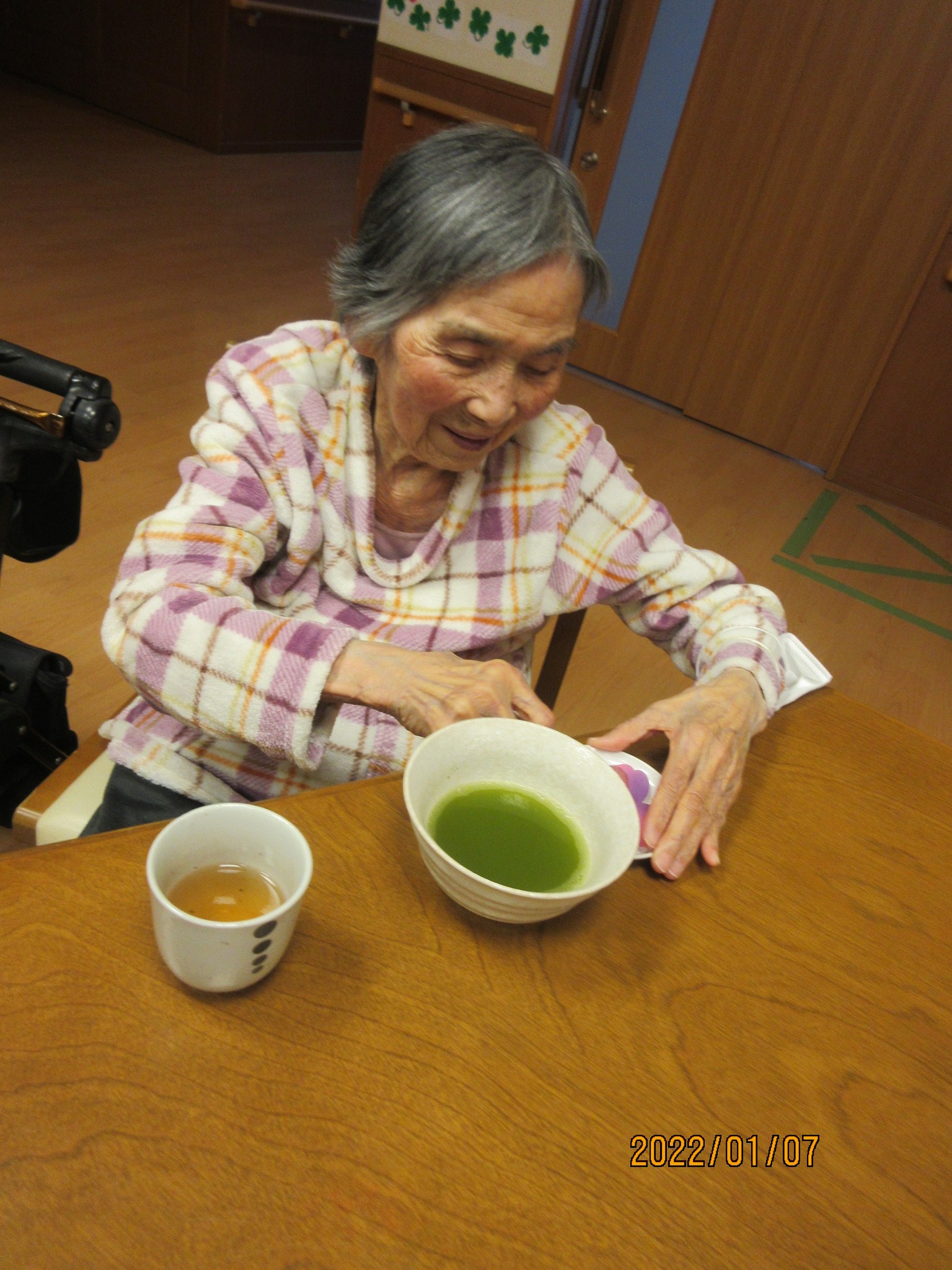 おやつの時間には、おめでたい練り切りお菓子とお抹茶で新年のお祝いをしました。