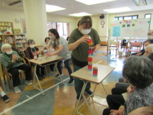大きなボールやピンポン玉を使用したりして、隣の方に皆さん素早く回しておられました!