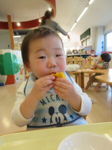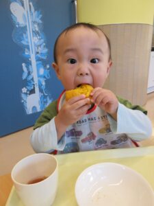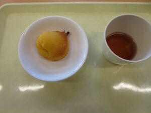 手作りおやつで、後期食は、かぼちゃの茶巾。幼児食は、かぼちゃマフィンでした。