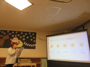特養へ入居されているご家族様へ、看取りケアの内容説明や長等の里が取り組んでいる「思いを実現」することの取り組み紹介を行い、今悩んでおられることなどを年一回説明させていただく場となっています