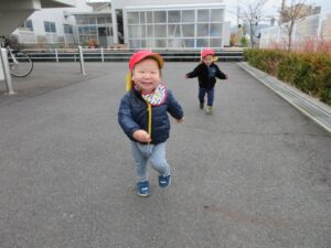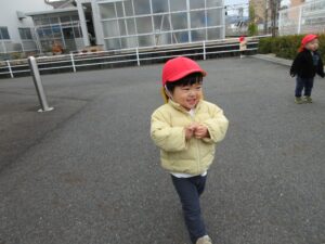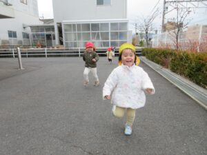 朝から雨がパラパラ降っていて、「おそとであそべるかな?」と子どもたちと話していましたが、雨が上がって園舎前で、1・2歳児で「よーいドン!!」と元気に走って身体を温めました。走っている時の子ども達の嬉しそうな顔がとっても活き活きしています。