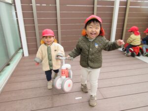 その後は、園庭でキックバイクや手押し車に乗って遊んだり、おままごとをしたり、砂山の滑り台を滑ったりとたっぷり戸外遊びを楽しみました。キックバイクを使い終わったら「わっしょい!わっしょい!」と1・2歳児の女の子たちが片付けるために力を合わせて運んでくれました。(砂山の滑り台の写真を取りに行こうと思ったら、終わってしまいました。泣。)