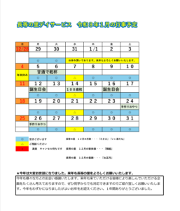 来月、令和8年1月の予定表です。まだまだ空きがございますので、