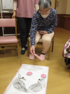 「おかめ」と「ひょっとこ」の絵柄をご用意し、目や鼻などの各パーツを他利用者様の応援の元、投げていただきました!!