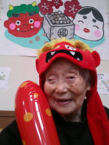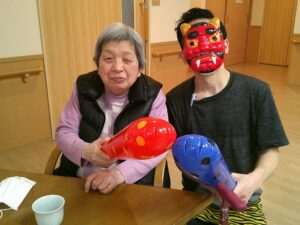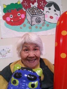 カーサ月の輪ショートステイでは、鬼のイラストのついた箱にボールを投げて無病息災を願いました。