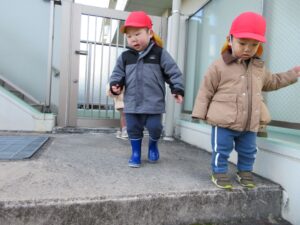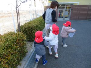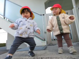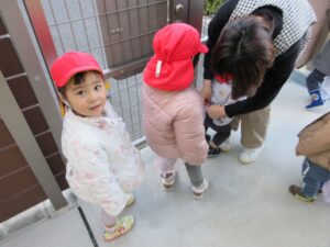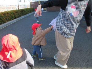 今日は、園舎前で“しっぽとり”をしました。何回か取り組んでいる“しっぽとり”ですが、2歳児の子どもたちはやる気満々!!保育者や友だちのしっぽを取りに行くのに一生懸命です。1歳児の子どもたちも追いかけることを楽しんでいますが、しっぽを付けられることを嫌がったり、取られないように逃げるのはまだまだ先のようです。途中から、近くの段差を上ったり下りたりを繰り返し足腰を鍛えていました。