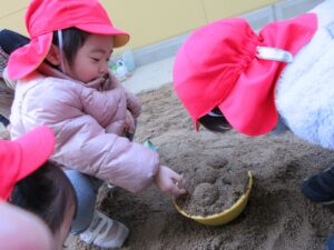 その後は、砂場でままごとや砂山を上り下りしたりを楽しみました。