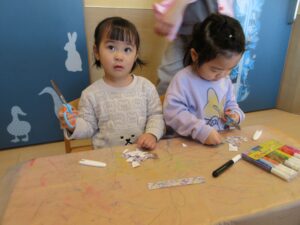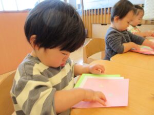 保育室に戻ってからは、ひな祭りの飾りを作りました。2歳児は、ハサミを使って長細い用紙を一回切り。とっても集中していましたよ。1歳児は、お内裏様とお雛様の目と口のシール貼りや菱餅の台紙にシール貼りをしました。素敵なひな祭りの飾りが出来そうです。