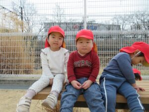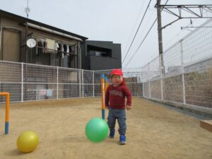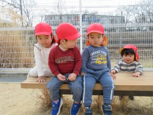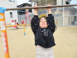 今日の朝はいいお天気だったので散歩に出かけました。近くの公園で、ブランコに乗ったり、鉄棒にぶら下がったり、ボール遊びをしたり、電車ごっこをしたり、疲れたらベンチに座って休憩したりといろんな活動をしました。