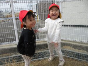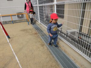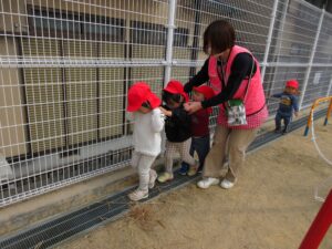 散歩の帰り道に建設中の建物の側にクレーン車があり、重たそうな木材を引っ張り上げている所を近くで見た子どもたちは「かっこいい」「すごーい」と目をキラキラさせて見ていました。毎回散歩の度に郵便配達やごみ収集など働いている方々を見て社会の様子を見ている子どもたちです。