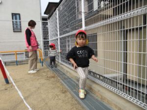 そのあと、別の公園に寄って、かくれんぼや滑り台もしました。かくれんぼは、2歳児のお姉さんが中心となって、鬼役・隠れる役に自然と分かれて「みつけたぁ」「みつかったぁ」と1歳児の子どもたちも交えて少しずつあそびが成り立ってきました。
