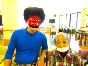 2月は節分を行いました👹鬼に扮した職員が遊びりテーションを行い、利用者様達にも投げる球を